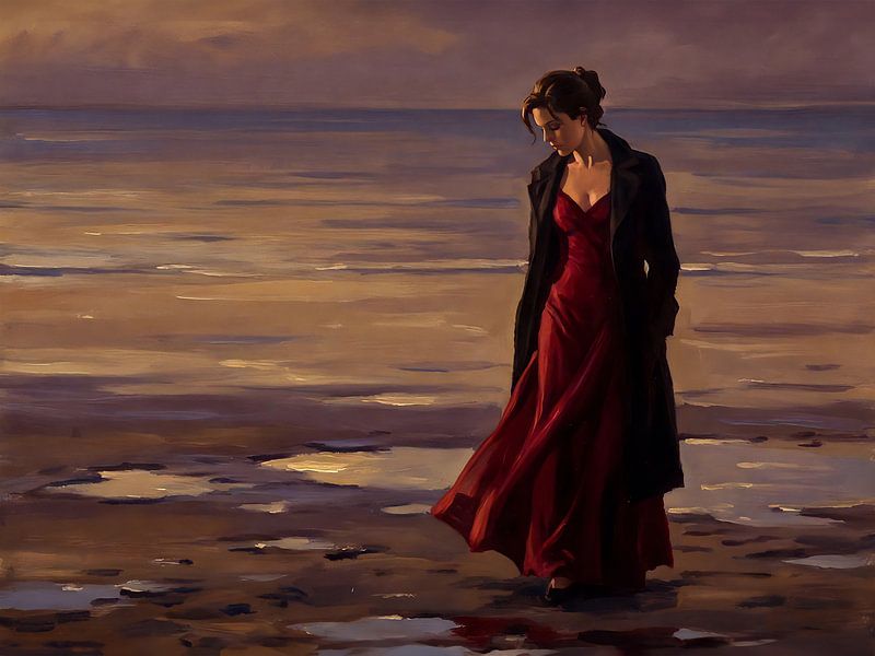 This painting captures a fleeting moment of introspection, where the vastness of nature mirrors the depth of human emotion. The woman, dressed in a flowing red gown, stands as the focal point—a vibrant contrast to the muted tones of the surrounding landscape. Her posture, slightly hunched with her gaze cast downward, suggests a quiet…