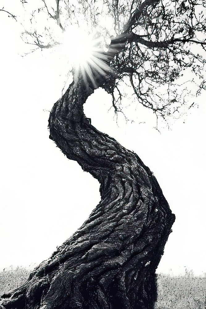 Black and white depiction of a curled tree in a lonely natural landscape. This work exudes serenity. The composition is balanced with the desolate landscape at the bottom, with the clear sky and sun at the top and the tree in the middle as a statement.