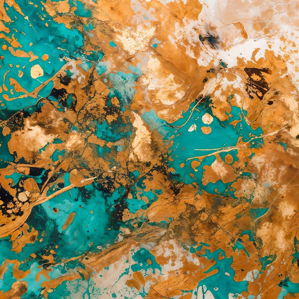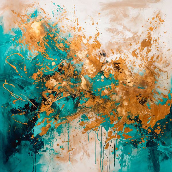 An abstract artwork with a dynamic interplay of turquoise and gold. The composition features splashes and drops of gold against a rich turquoise background, creating a sense of movement and energy.