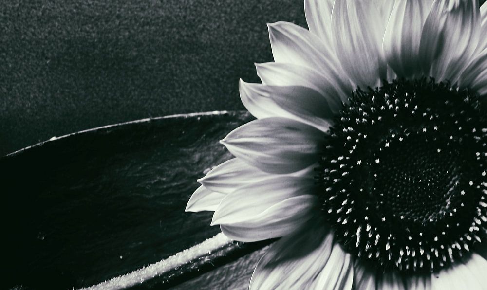 Stillleben Sonnenblume in einer Schale aus Baumrinde
