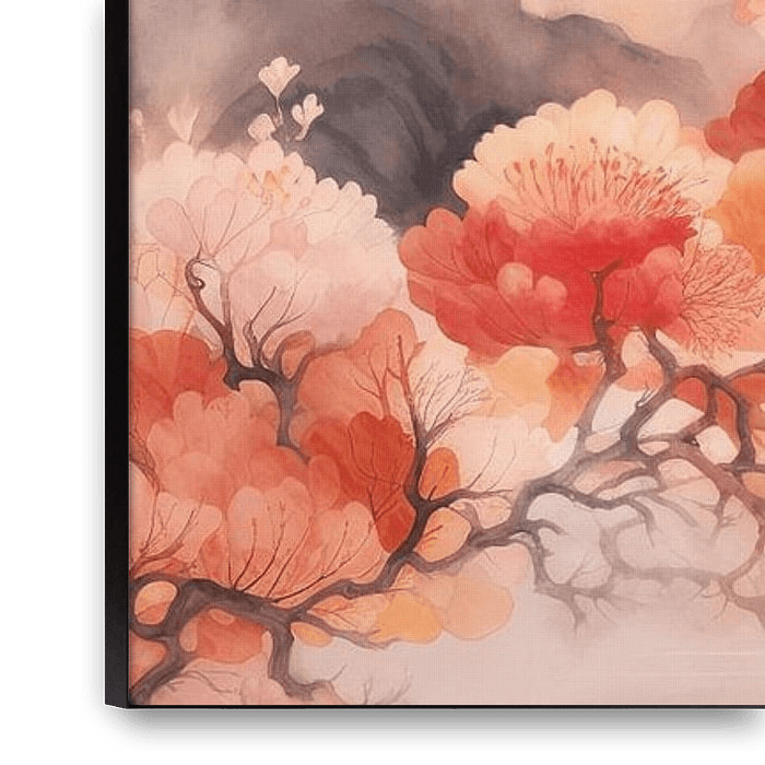 Soothing Blossom Landscape - This serene artwork exudes a delicate calm with its soft transitions and dreamy rendering of blossom trees and mountain scenery. The subtle mix of Peach Fuzz hues, complemented by grey outlines and a touch of orange, invites reflection and relaxation. The style is a balance between realistic and…
