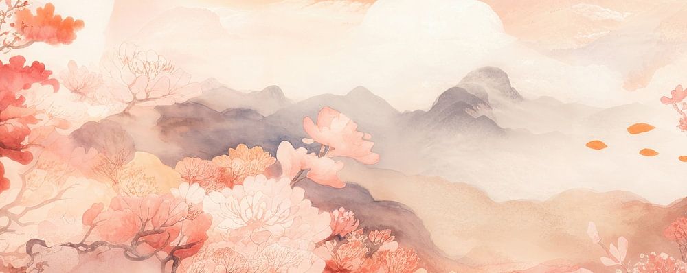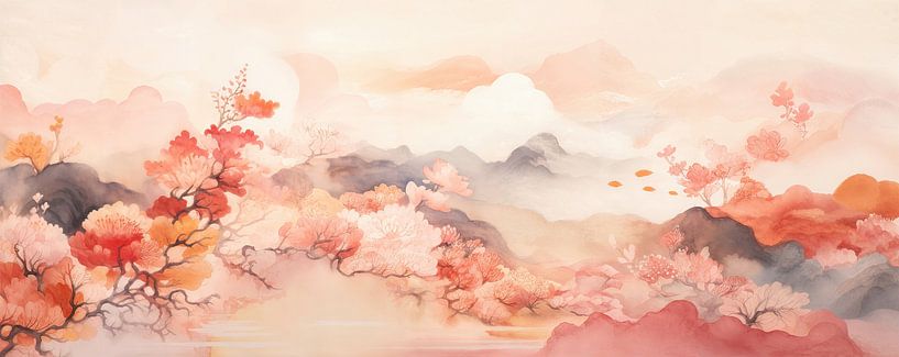 Soothing Blossom Landscape - This serene artwork exudes a delicate calm with its soft transitions and dreamy rendering of blossom trees and mountain scenery. The subtle mix of Peach Fuzz hues, complemented by grey outlines and a touch of orange, invites reflection and relaxation. The style is a balance between realistic and…