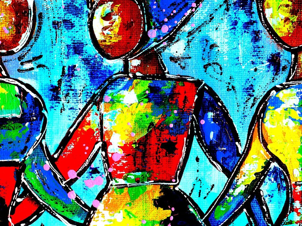 Three women stand side by side, rooted in colour and strength. Their bodies are composed of expressive sweeps of red, yellow, green, blue and gold - like layers of their stories, emotions and memories. Each brushstroke exudes vibrancy, and yet their stance is soft, protective and connected.