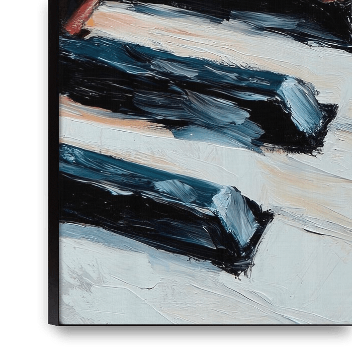 A single finger glides elegantly over the keys, while the black and white contrasts reveal the musical tension. The dynamic colour palette and vibrant texture of the brushstrokes lend the moment a sense of urgency and passion. In this scene, the sounds merge with the visual experience to create a harmonious whole.