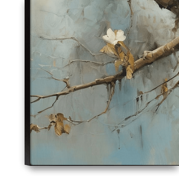 Sparrows Nature Art - Here you see a charming scene of two sparrows sitting peacefully on a branch, surrounded by delicate blossoms. The soft blue-grey background contrasts beautifully with the warm brown tones of the birds and branch, while touches of white make the flowers and feathers shine. It is a piece that radiates tranquillity…