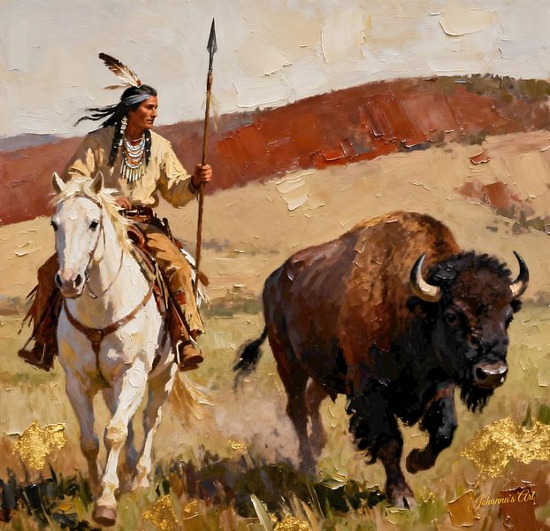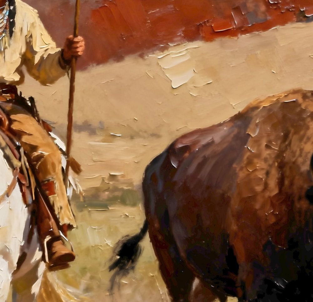 A Native American rider surges across the open plains atop a powerful white horse, spear held firmly as he pursues a bison in a moment charged with purpose and tradition. The vast landscape stretches endlessly around them, the earth alive with motion and meaning. Dust rises beneath pounding hooves, while wind pulls at hair and garments,…