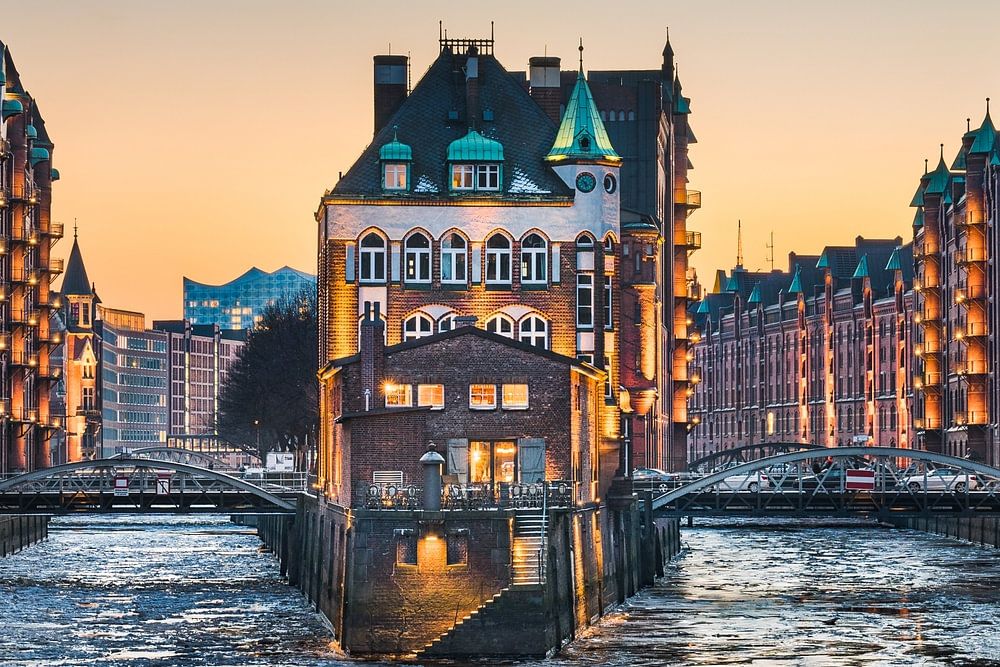 The Speicherstadt district in Hamburg, Germany on a winter evening