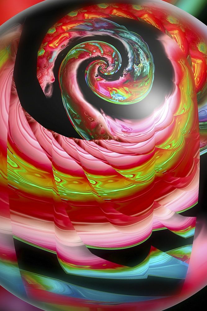 Decorative image digitally generated with a Droste filter algorithm of colours, shapes and light. The fourth image from an open series of Droste spirals projected onto a sphere.