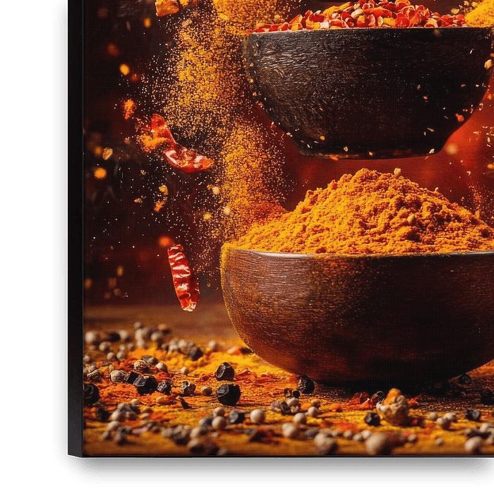 A fiery feast of flavours unfolds in floating spices that swirl vividly through the air. The vibrant colours of paprika and turmeric draw the eye and whet the appetite. Perfect for the kitchen, this work of art inspires cooking and adds a delicious atmosphere to the room.