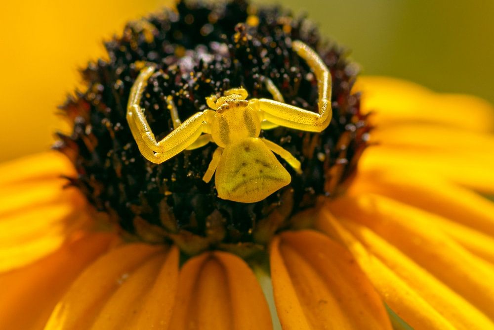 Swollen thombshell on the hunt for an orange rudbeckia flower. The female of this species of spider has the ability to adapt her colour to that of the flowers on which she hunts. Orange rudbeckia can be taken as an infusion to prevent or treat colds.