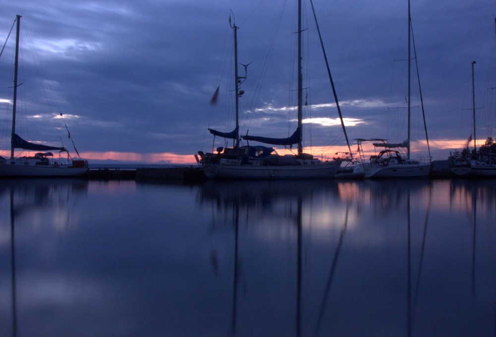 Bootjes weerspiegelen in het avondlicht, in de kleine charmante haven van Lund, British Columbia, Canada.