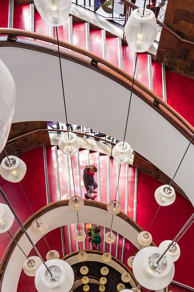 Spiral staircase in the stairwell at the college's main location in Rotterdam in Museumpark! A look down from the top floor! With the beautiful stained-glass windows in the background! One of the most beautiful spiral staircases in the Netherlands!