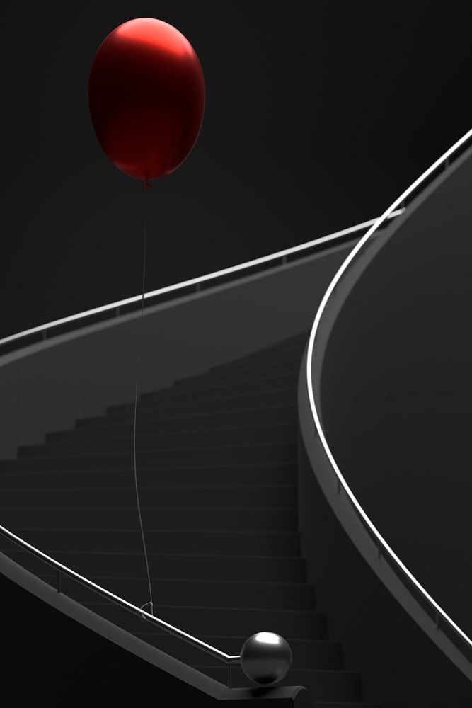 A spiral staircase in dim light with a balloon. A scene that challenges the imagination and leaves room for interpretation.