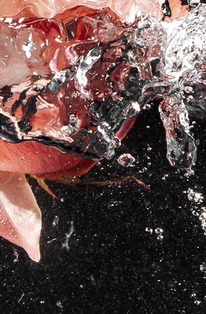 When a peach and a rose take the plunge into cold water together, creative swirls and turbulence form in the liquid. Captured with a short exposure time, wonderful image creations emerge.