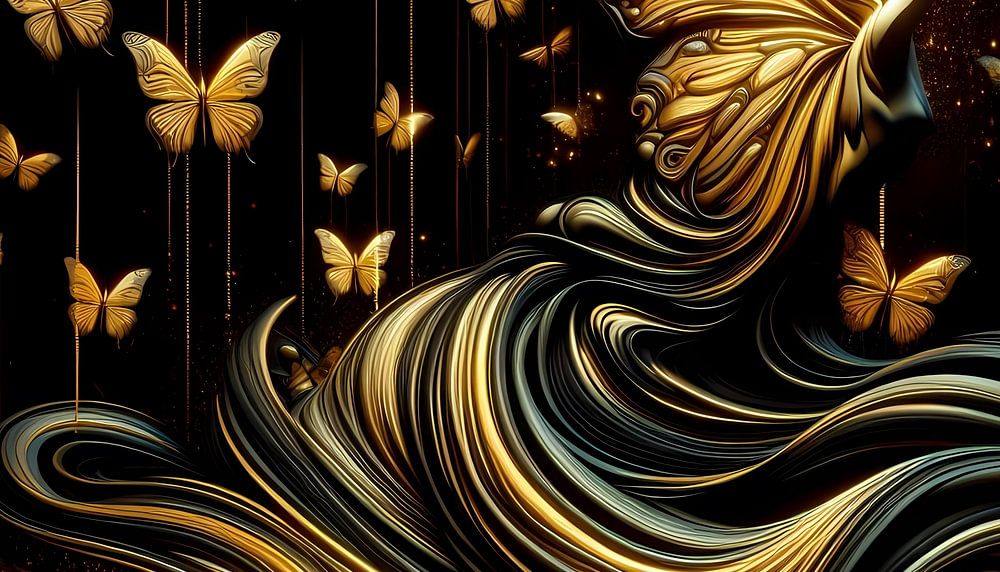 This artwork features a stunning golden butterfly creature designed with intricate details and shimmering textures. The wings glow in different shades of gold and catch the light in a mesmerising way, creating a dynamic movement. The butterfly floats majestically above a soft background in soft pastel colours, emphasising the beauty and grace of the creature. This art painting conveys a sense of freedom and elegance, transporting the viewer to a dreamy world.