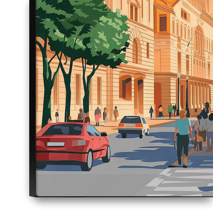 A vibrant cityscape comes to life as the warm, sand-coloured facades of the buildings glow in the sunlight. People stroll relaxed along the streets, while the imposing silhouette of the clock tower towers proudly over the scene. Green foliage and bright blue skies provide the perfect backdrop to the vibrant heart of Split, Croatia.