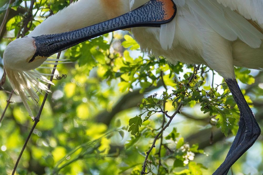 How can such a large animal keep its balance on one branch? What a great sight, a cleaning spoonbill in the tree. Quietly he cleans his hair, balancing on the branch.