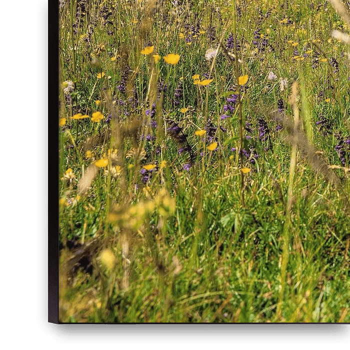 Buy this flower art Spotted cow in a meadow full of flowers in the Italian dolomites by Wout Kok on canvas, ArtFrame, poster and wallpaper, printed on demand in high quality.