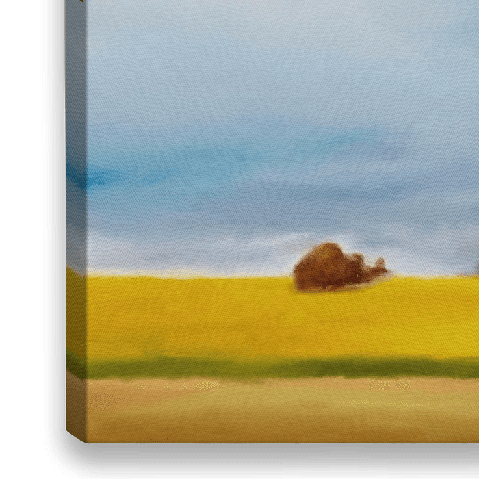 Golden yellow fields and small groves of forest in a wide open spring landscape in southern Canada characterize this refreshing landscape painting by Roberto Moro.