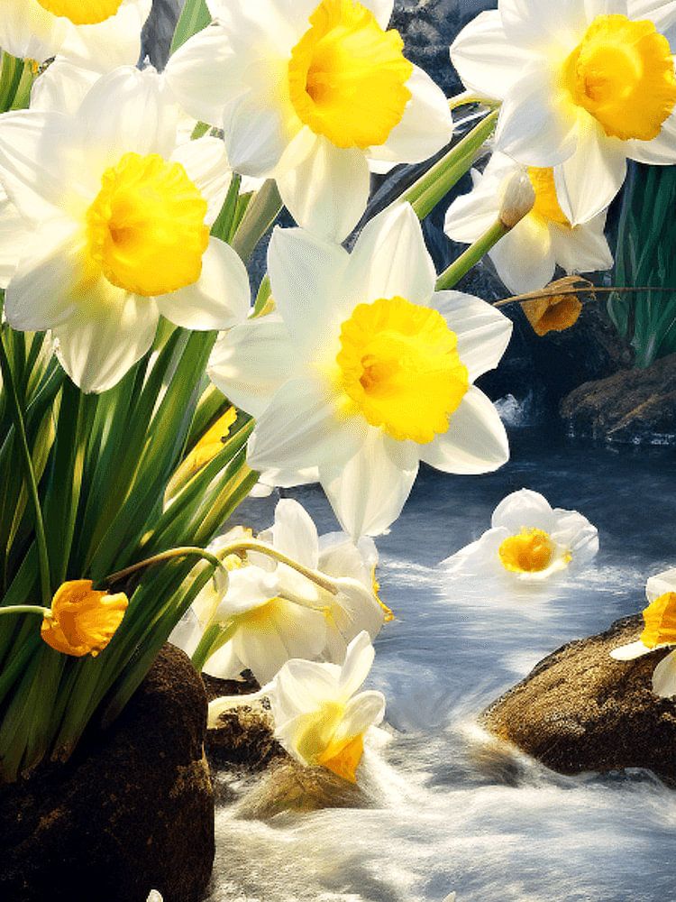 This picture shows a poetic spring scene of enchanting harmony. Bright white daffodils with sun-yellow calyxes bloom vividly on the banks of a glistening stream. Some of the flowers float gently on the water and are reflected in the gentle current, while the soft light lends them an almost unearthly luminosity. The background, with shady fir trees and moss-covered stones, creates a calm, almost fairytale-like atmosphere - a quiet dialogue between light, nature and water.