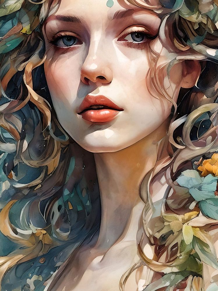 This enchanting watercolour portrait captures the essence of spring in soft pastel shades, where a young woman is surrounded by the freshness of the season. Her long, curly hair falls like a waterfall of maroon hues, in which spring flowers and fresh green leaves nestle like precious jewels.