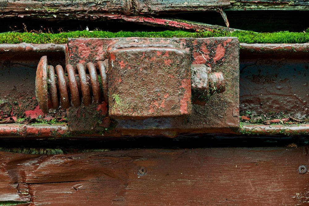 Close-up picture of a spring as a stop to catch a sliding door so it doesn't run out of its rails. The spring is mounted on an old wooden railway carriage.