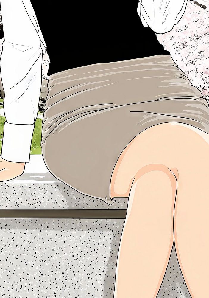 This painting shows an elegant woman sitting on a stone bench under flowering cherry trees. The style is a mixture of illustration and realism, with clean lines and soft colours that create a calm and graceful atmosphere. The woman is wearing a classic business outfit: a white blouse with an open collar, a black top underneath and a beige pencil skirt that emphasises her figure. Her legs are crossed and she wears black pumps to complete her look. Her blonde hair is pinned up in a bun and she has a soft smile on her lips as she puts her hand to her chin, suggesting thoughtfulness or relaxation. Next to her on the bench is a black handbag, emphasising her professional style. The background is dominated by delicate pink cherry blossoms, creating a romantic and spring-like mood. Green grass and dark tree trunks round off the scene. The picture radiates an aura of elegance, tranquillity and femininity. It is a tribute to the beauty of nature and the ability to find a certain grace in everyday moments. The composition is balanced and the details of the clothing and surroundings are precisely depicted, giving the painting a high quality. It is a work that celebrates the beauty of the female body and the elegance of fashion, set in an idyllic spring landscape.
