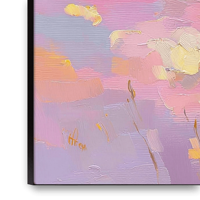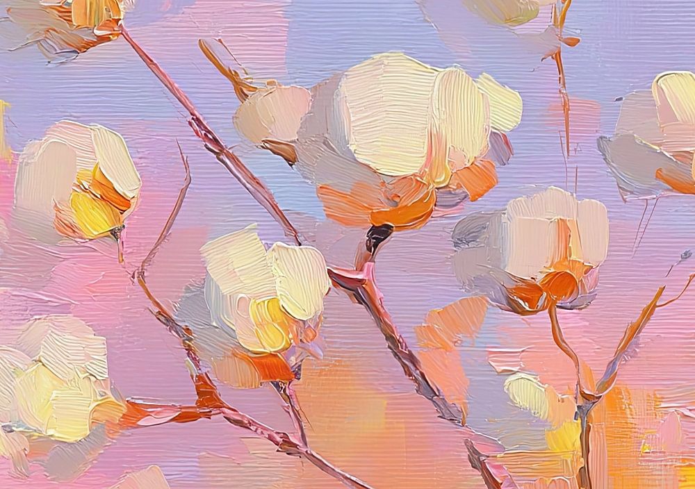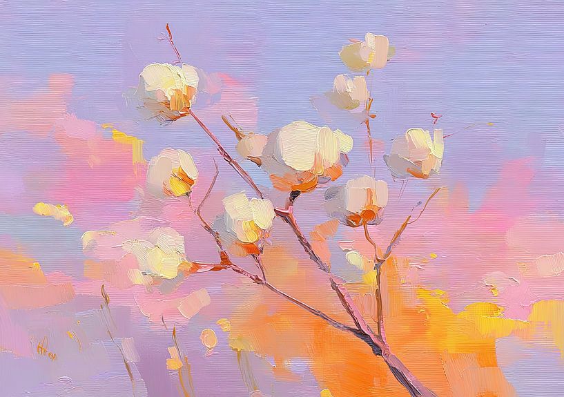 White blossoms on delicate branches form the centrepiece of this depiction. The background is designed in shades of lilac, pink and warm orange, reflecting the light atmosphere of dusk. The composition focuses on the botanical details and the interplay of light and shadow on the surfaces. Warm yellow tones add accents and complement the…