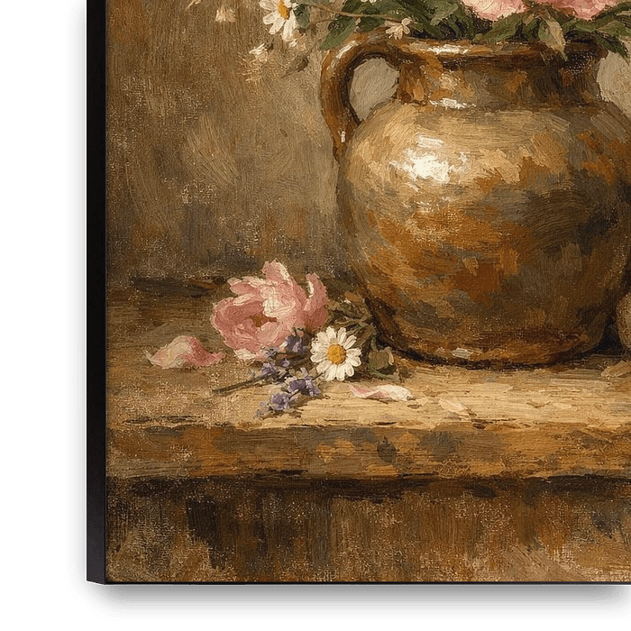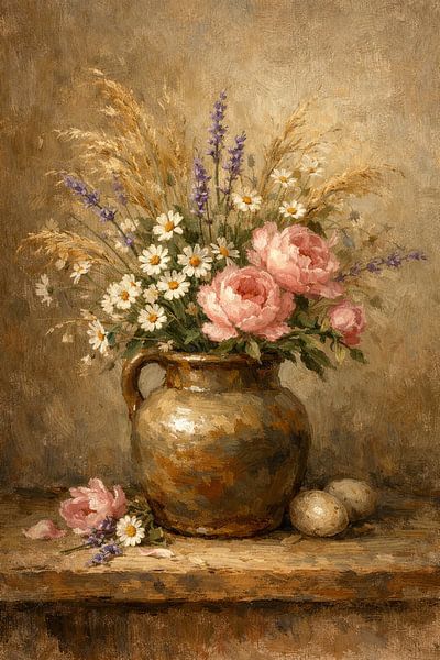 An atmospheric still-life arrangement of wildflowers — peonies, daisies and lavender — in a rustic earthenware vase. Inspired by the Dutch Golden Age but rendered in a warm, contemporary colour palette of cream, terracotta and sage green. The soft, natural light and visible brushstrokes lend this piece a traditional charm.