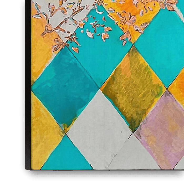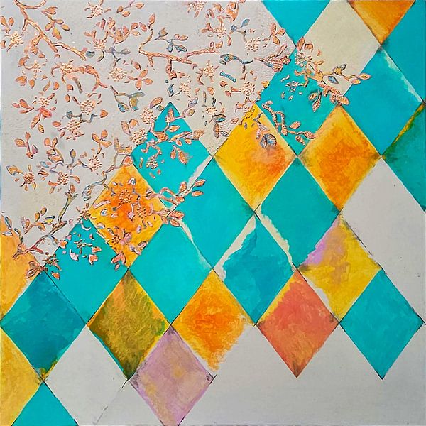 Spring feeling is an ode to the moment when winter finally lets go. This work combines my love of clean patterns and soft, decorative details. The harlequin checks in teal, soft yellow and warm orange provide structure and rhythm, while the copper-coloured branches grow right through them – like the first blossoms that pay no heed to…