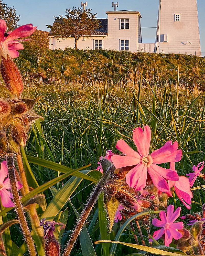 Evening colors brightening the lighthouse and newly budding flowers. Location: Alnes, Godøy, Giske, Sunnmøre, Møre og Romsdal, Norway.