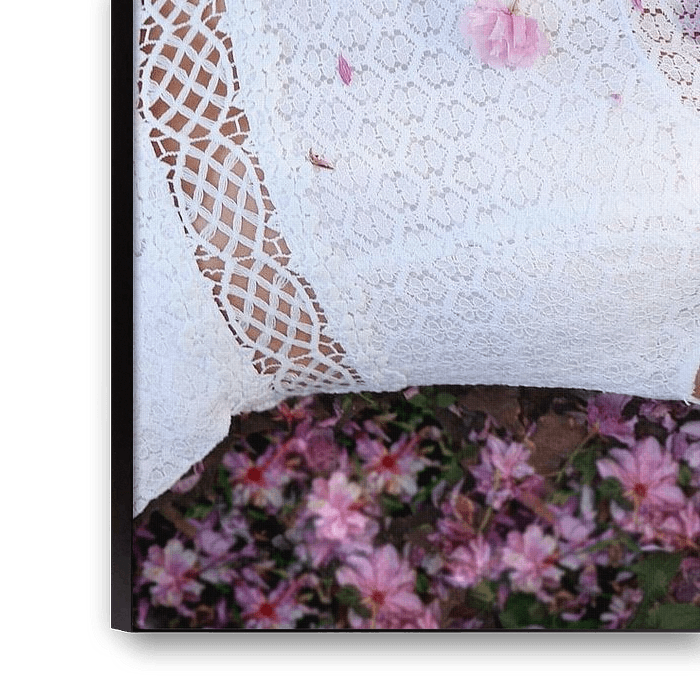 This fine art portrait features a young girl lying among a carpet of pink blossom petals. She wears a delicate white lace top, which contrasts beautifully with the vivid background. Her serene expression, soft lighting, and subtle pink makeup create a cohesive and elegant composition.