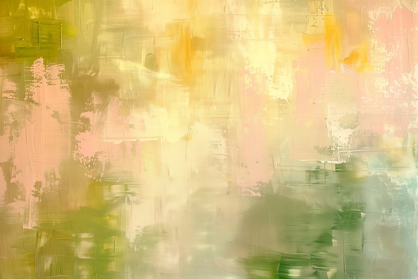 Light green, yellow and soft peachy tones dominate this painting. The colours are applied loosely and playfully, making the whole reminiscent of an abstract landscape in spring light. Nothing is literal, but the colour distribution suggests space and depth. The greens range from fresh grass green to soft mossy, while the yellow tones…