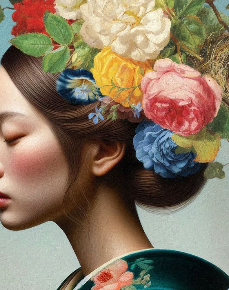 Portrait of a Japanese woman in kimono, in hair flowers and a bird and bird's nest.