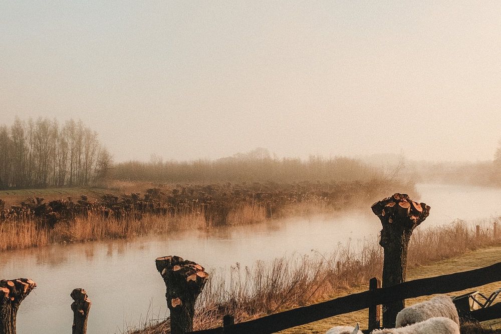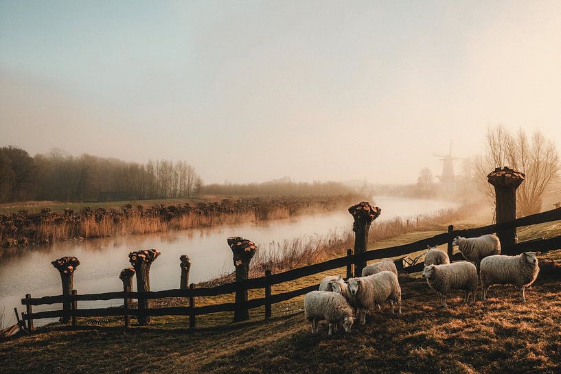 A pleasant spring morning in the Betuwe region near the village of Deil. Sheep and their lambs graze in the meadow while a thin mist hangs over the fields. In the distance, the characteristic De Vlinder windmill can be seen in the soft golden morning light.