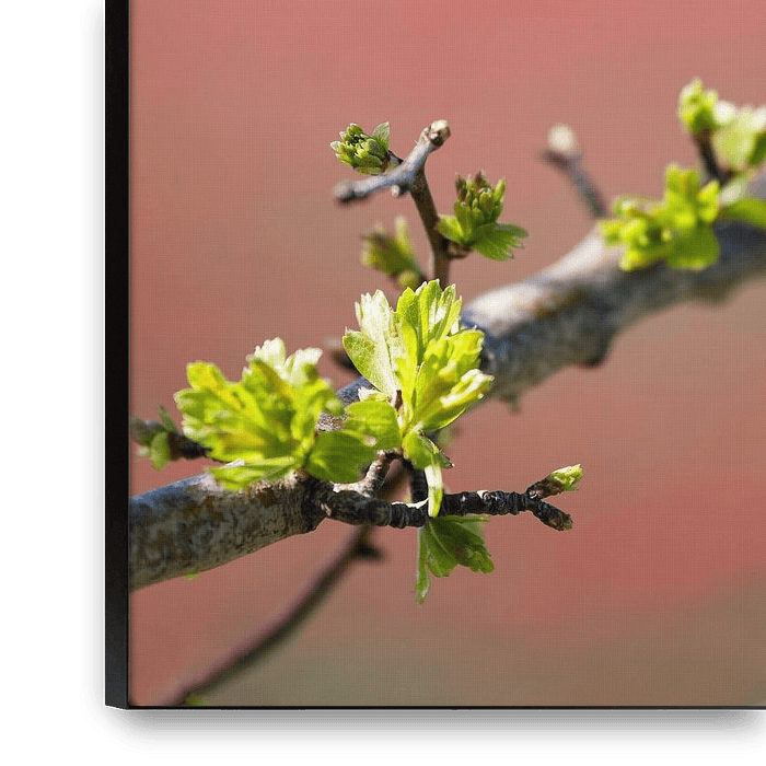 Budding leaves on a tree branch standing amongst the bulb fields. Thanks to the strong bokeh, the tulip fields in the background have become smooth patches of colour.