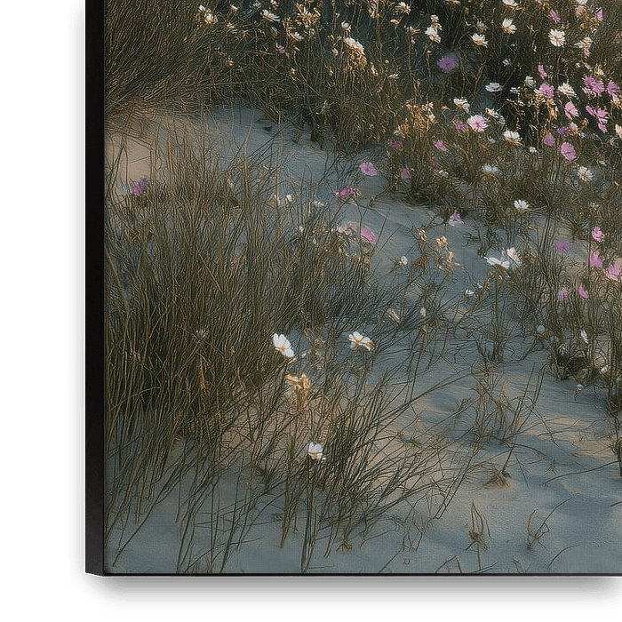 Blooming wildflowers colour the dunes in the early morning light, while mist slowly drifts over the sea. In the distance, a lighthouse, half hidden by the mist, appears as a silent landmark in the landscape. The soft pastel shades and subtle depth create a dreamy, almost timeless atmosphere.