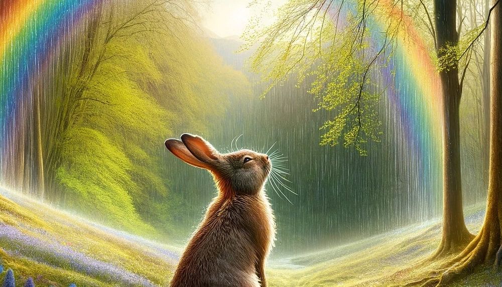 A spring-like scene unfolds in which a hare looks up in admiration at a glowing rainbow that adorns the sky after a rain shower. The sunlight filtering through the trees bathes the landscape in a warm glow and illuminates the variety of flowers on the forest floor. The rain, still visible in the air, enhances the colours of the rainbow and creates a bridge between the awakening of nature and the blue of the sky. This magical moment is watched in silent awe by the hare, who experiences the miracle of spring in a world full of colour and life.