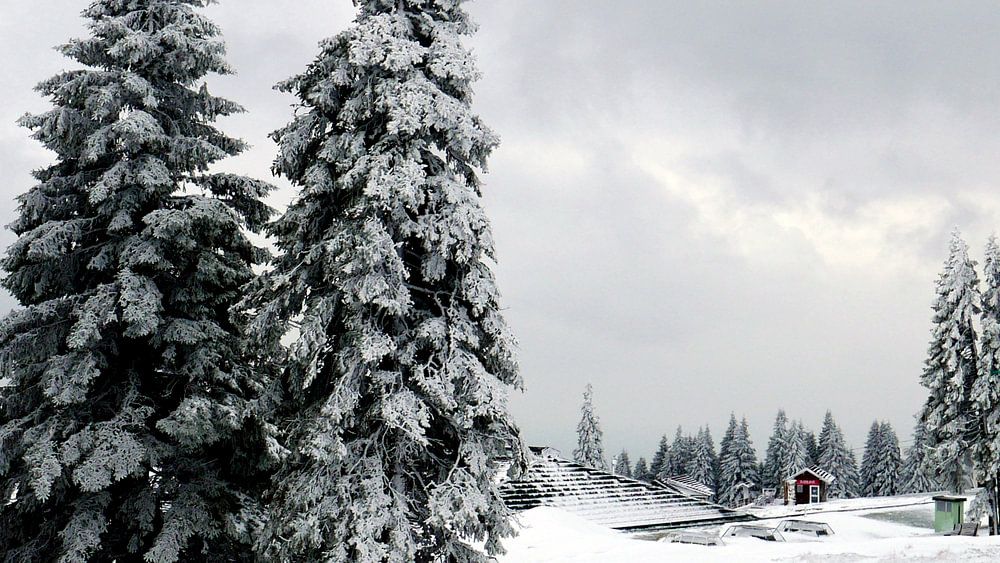 Spruce trees in the snow near Rogla in the Slovenian Alps. Because of the snow the image looks black and white with many shades of gray.