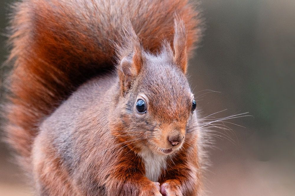 Squirrel in the forest. Beautiful with its tail up. So sweet to see them sitting like that. Nice for a children's room, but also in the living room. Brown and green colours.