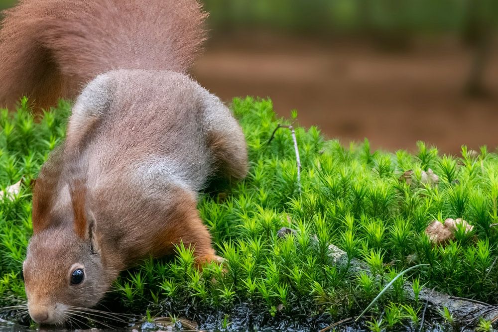 A thirsty red squirrel in early spring after a few dry days.