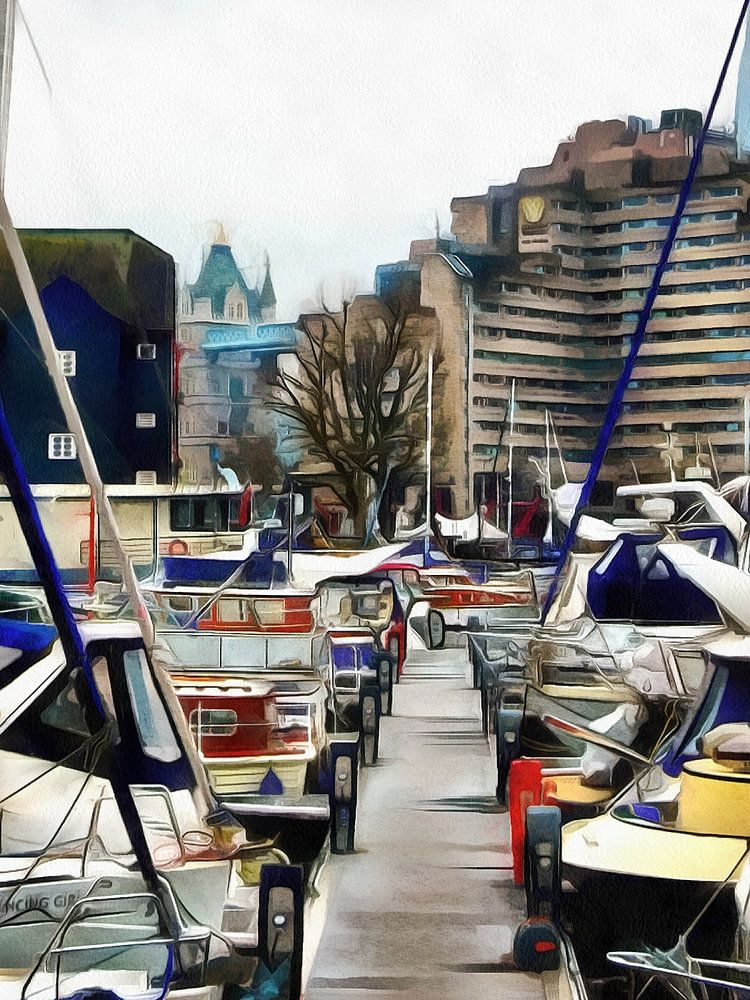 A look down the boardwalk which seems like a vast amount of space given how crowded with boats and barges St Katharine Docks is. This luxury marina and apartment complex sits on the River Thames in London, England. In the distance you can just vaguely see Tower Bridge and The Shard.
