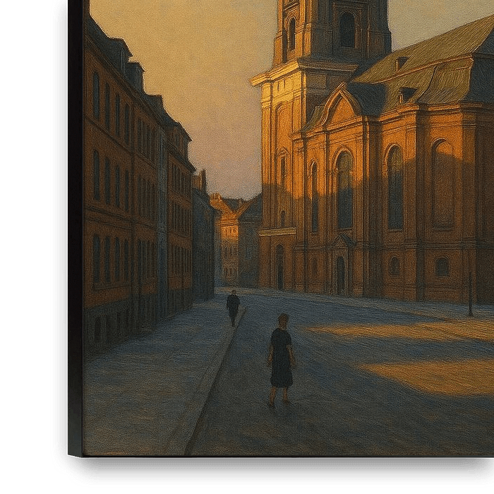 This majestic and contemplative painting features the soaring tower of St. Michael's Church (Hauptkirche Sankt Michaelis), affectionately known to locals as "Michel," Hamburg’s most famous landmark. The baroque copper spire and the clock face are bathed in the warm, rich light of the late afternoon sun, glowing like a beacon against a…