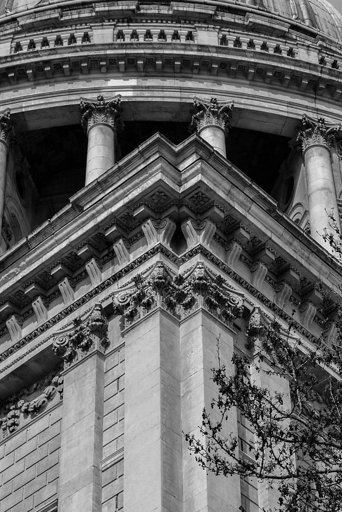 St Pauls Cathedral in London. In zwart en wit. DE kathedraal ligt midden in de Londense binnenstad, de City.