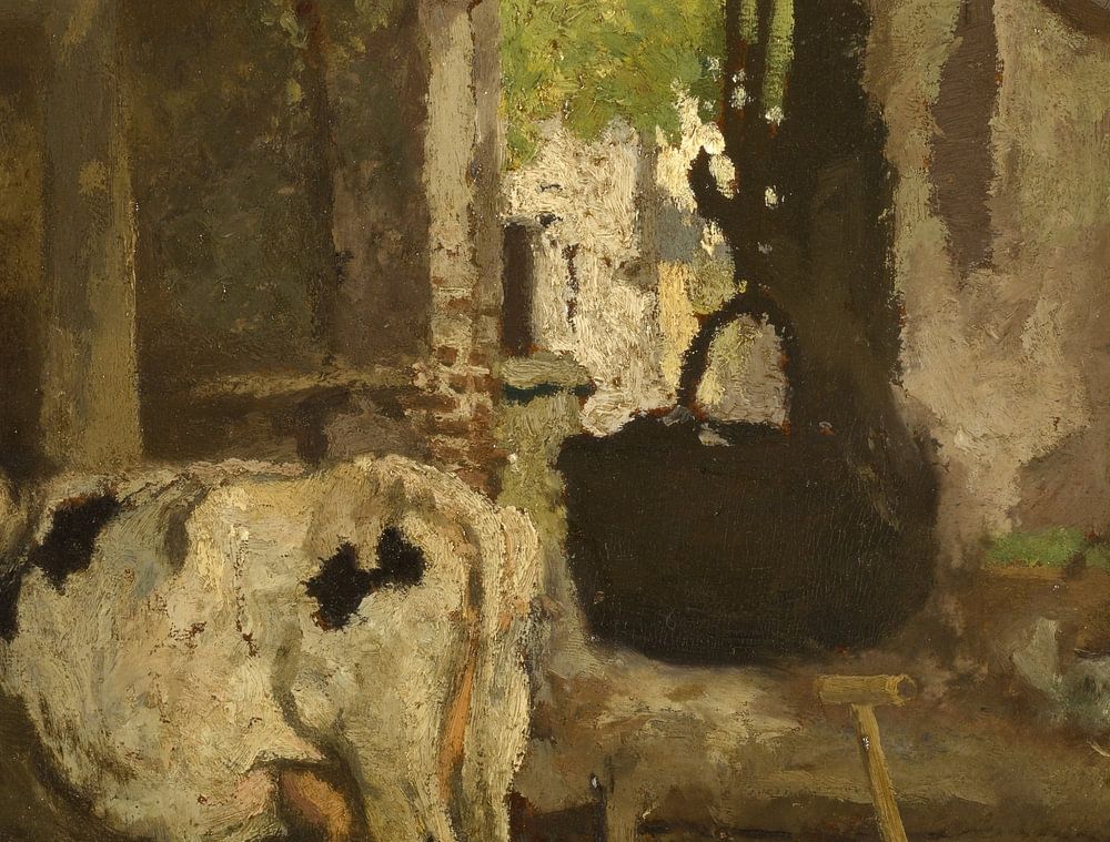 In the sample is a bovine, a cow eating from the manger. Adriaan Jozef Heymans (Antwerp, 11 June 1839 - Schaarbeek, 16 December 1921) was a Belgian landscape and genre painter, who also painted seascapes, and watercolourist. He is considered the spiritual father of the Kalmthout School and was also a leading Belgian Impressionist painter.