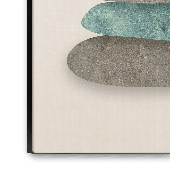 This work combines acrylic monoprinting and digital editing. Six rocks in earth colors are stacked into a cairn. The background is cream white. The image invokes a feeling of calm, zen, and balance.