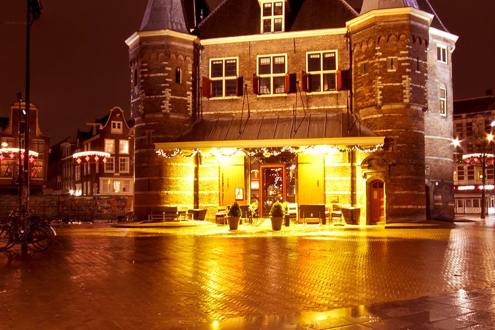 Stadgezicht van de Nieuwmarkt in Amsterdam bij nacht