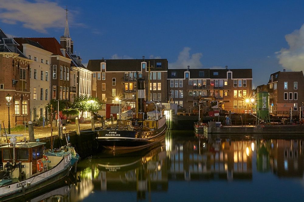 Evening photography in the blue hour at the old harbour De Kolk in Maassluis. View of the Stadhuiskade. The buildings reflect beautifully in the still water. On the quay in the corner is the steam tug The Furie.