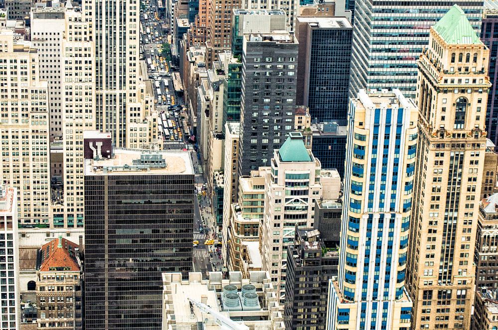 Stadsjungle New York City gezien vanaf het Empire State Building. Een en al hoogbouw en krioelende autootjes.