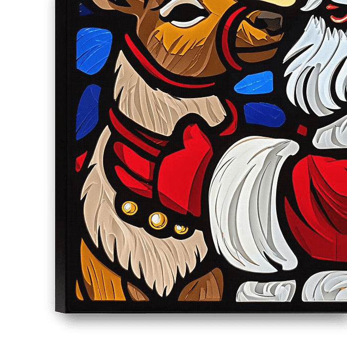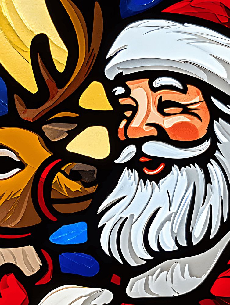 This artwork features a stunning stained-glass style illustration of Santa Claus gently holding his loyal reindeer beneath a glowing crescent moon and starry winter sky. Rich colors, smooth glass-like texture, and warm festive lighting create a magical Christmas atmosphere.